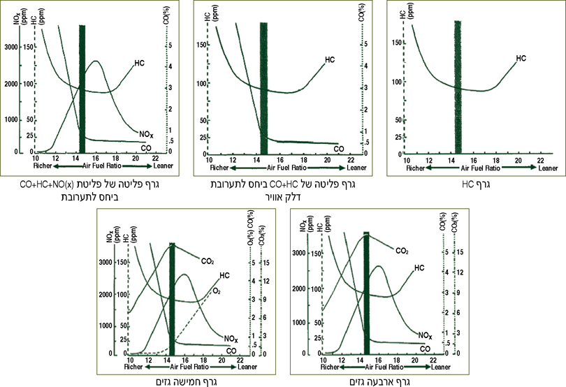 כפי שניתן לראות בגרף CO+HC+NO(x), רמות ה-HC וה-CO נמוכות ביחס תערובת אידיאלי או ביחס קרוב לזה. הדבר מחזק את הצורך לשמור על יחס תערובת מדויק. מצד שני, פליטת ה-NO(x) גבוהה מאוד בתערובת מעט ענייה יותר. היחס ההפוך הזה בעייתי כאשר מנסים לשלוט בכמות המזהמים הנפלטת מהרכב. יחס מורכב זה הוא דוגמה מצוינת לבעייתיות של צמצום פליטת המזהמים ממנועי בנזין.