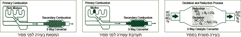 כאשר משתמשים במכשירי אבחון לגזי הפליטה, חשוב לזכור שפעולת הבעירה מתרחשת פעמיים לפני הגעתה לצינור הפליטה: בפעם הראשונה התערובת בוערת בתא השריפה. בעירה זו מגדירה את הרכב הגזים שמגיעים לממיר ואשר משפיעים על יעילות ההמרה באופן דרמטי. כאשר הגזים מגיעים לממיר התלת-דרכי, מתרחשים שם שני תהליכים כימיים במהלך הבעירה המשנית: הפחתה קטליטית וחמצון קטליטי.